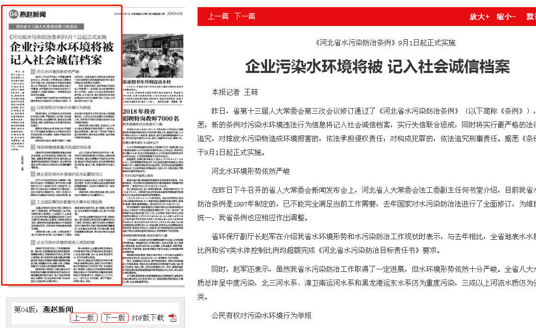 昨日,省第十三届人大常委会第三次会议修订通过了《河北省水污染防治条例》(以下简称《条例》),据悉,新的条例对污染水环境违法行为信息将记入社会诚信档案,实行失信联合惩戒,同时将实行最严格的法律责任追究,对排放水污染物造成环境损害的,依法承担侵权责任;对构成犯罪的,依法追究刑事责任。据悉《条例》将于9月1日起正式实施。
