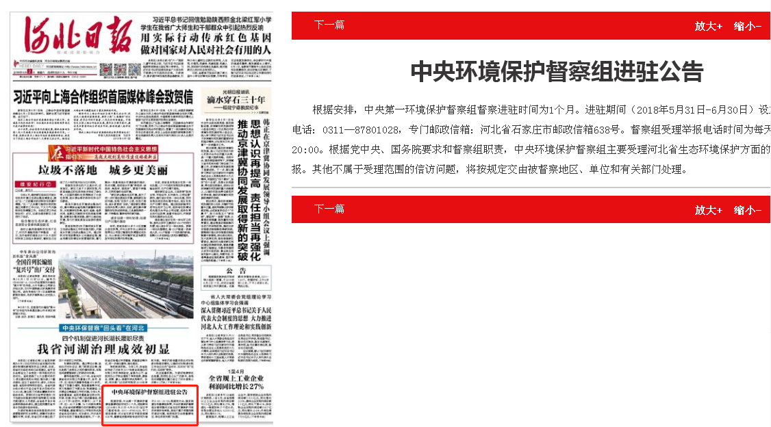 根据安排,中央第一环境保护督察组督察进驻时间为1个月。进驻期间(2018年5月31日-6月30日)设立专门值班电话:0311—87801028,专门邮政信箱:河北省石家庄市邮政信箱638号。督察组受理举报电话时间为每天8:00~20:00。根据党中央、国务院要求和督察组职责,中央环境保护督察组主要受理河北省生态环境保护方面的来信来电举报。其他不属于受理范围的信访问题,将按规定交由被督察地区、单位和有关部门处理。