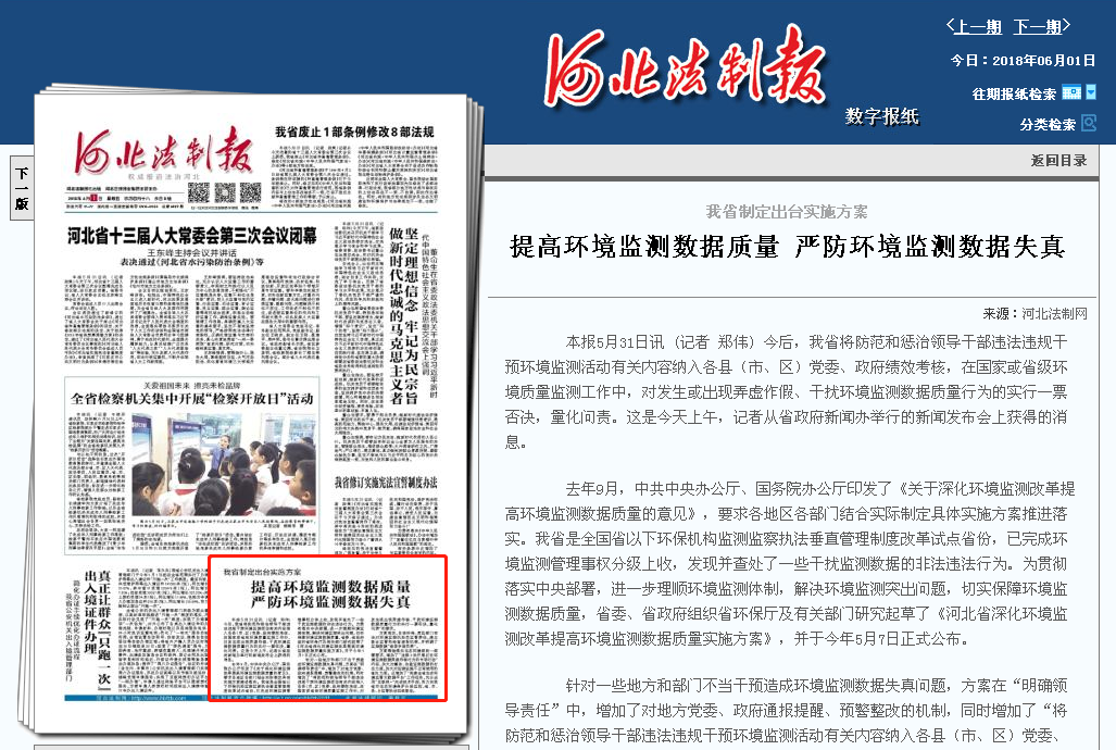 河北法制报:我省制定出台实施方案 提高环境监测数据质量 严防环境监测数据失真