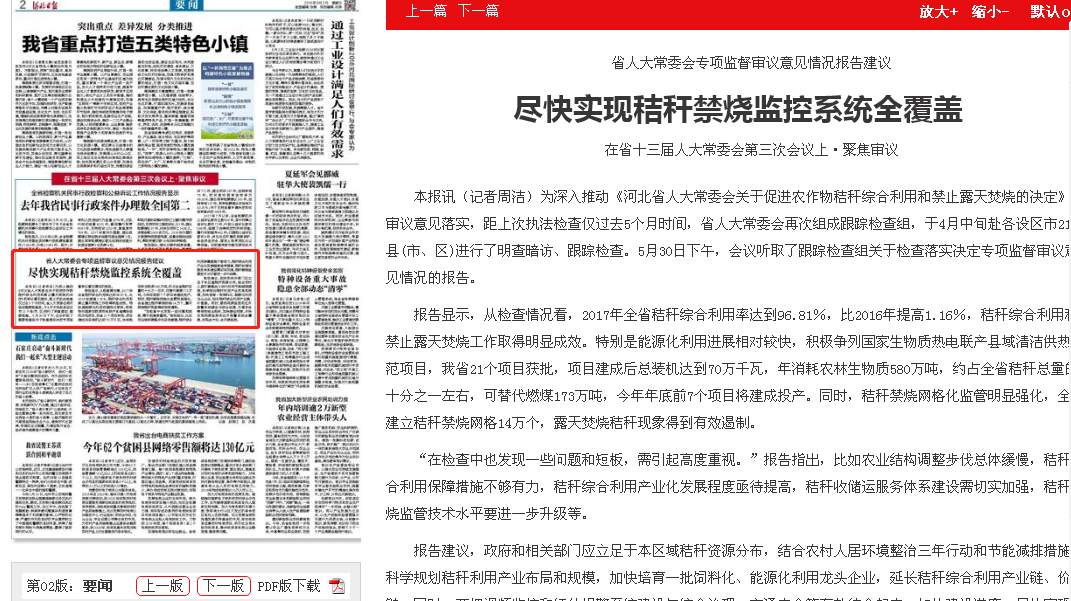 河北日报:省人大常委会专项监督审议意见情况报告建议 尽快实现秸秆焚烧监控系统全覆盖