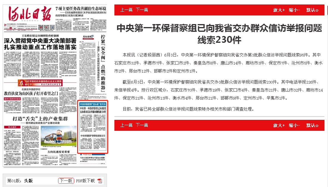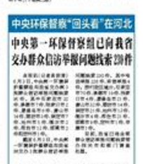 河北日报头版专栏:中央第一环保督察组已向我省交办群众信访举报问题线索230件