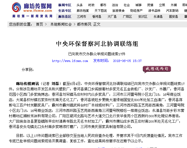 廊坊传媒网: 中央环保督察河北协调联络组已向我市交办群众举报问题线索17件