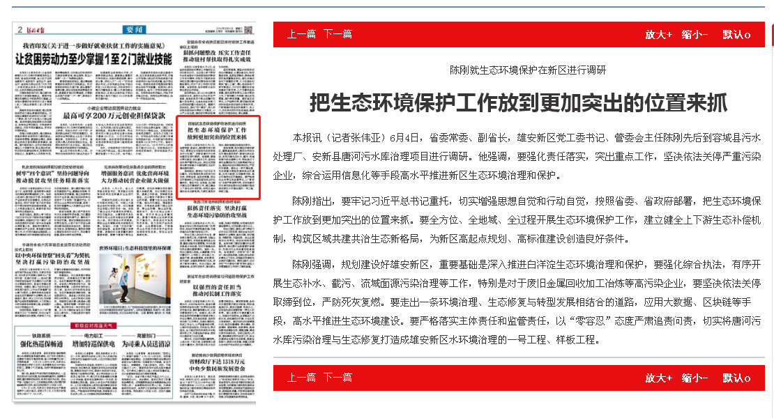 河北日报: 陈刚就生态环境保护在新区进行调研 把生态环境保护工作放到更加突出的位置来抓