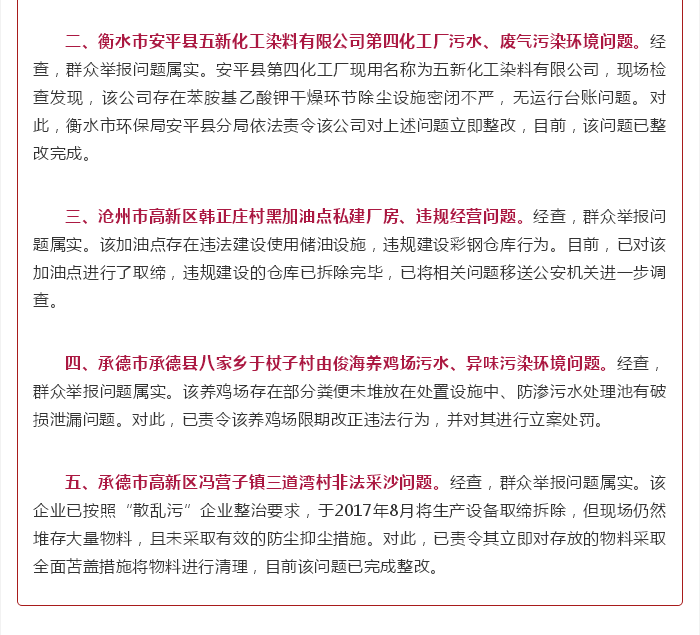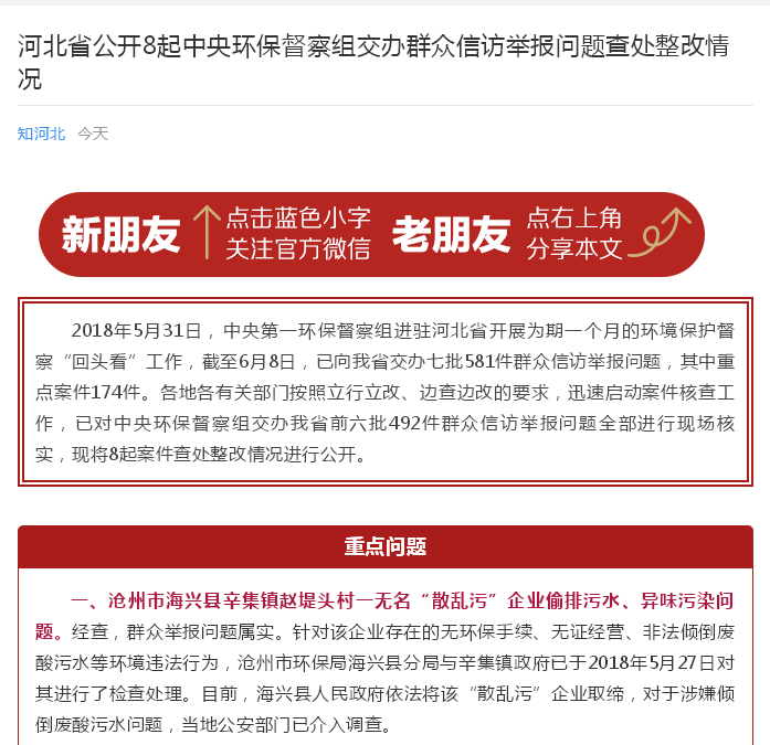 知河北:河北省公开8起中央环保督察组交办群众信访举报问题查处整改情况