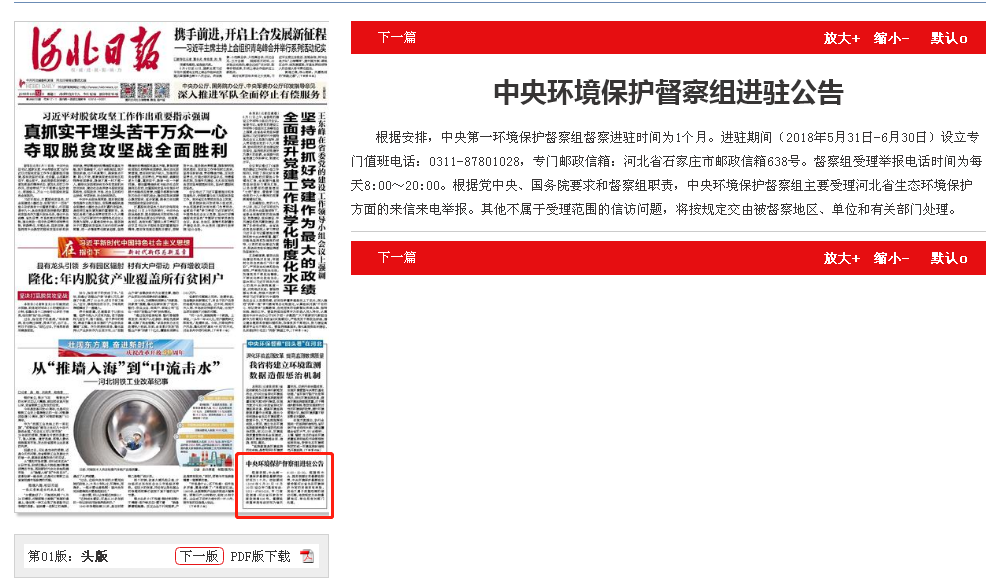 河北日报:中央环境保护督察组进驻公告