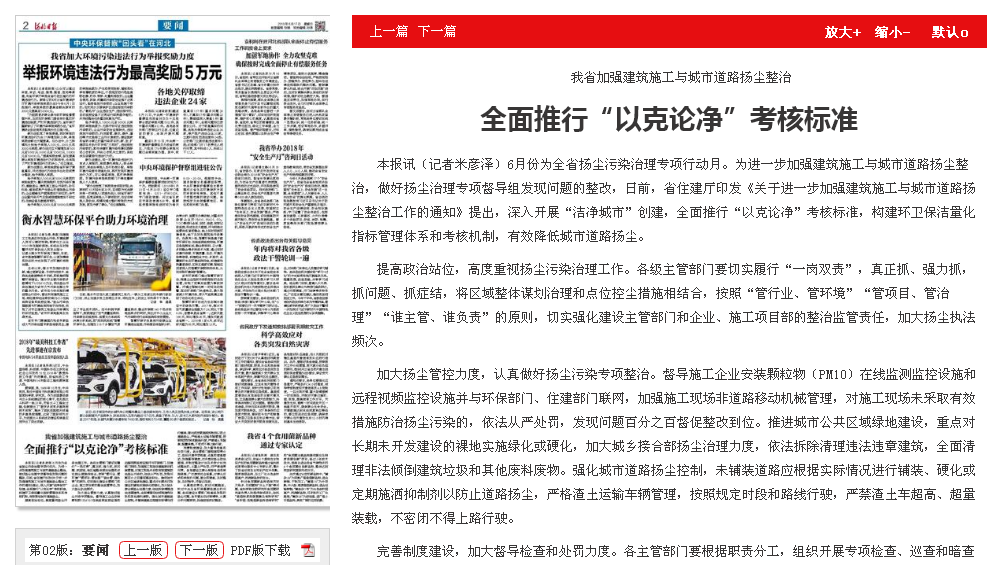 本报讯(记者米彦泽)6月份为全省扬尘污染治理专项行动月。为进一步加强建筑施工与城市道路扬尘整治,做好扬尘治理专项督导组发现问题的整改,日前,省住建厅印发《关于进一步加强建筑施工与城市道路扬尘整治工作的通知》提出,深入开展“洁净城市”创建,全面推行“以克论净”考核标准,构建环卫保洁量化指标管理体系和考核机制,有效降低城市道路扬尘。