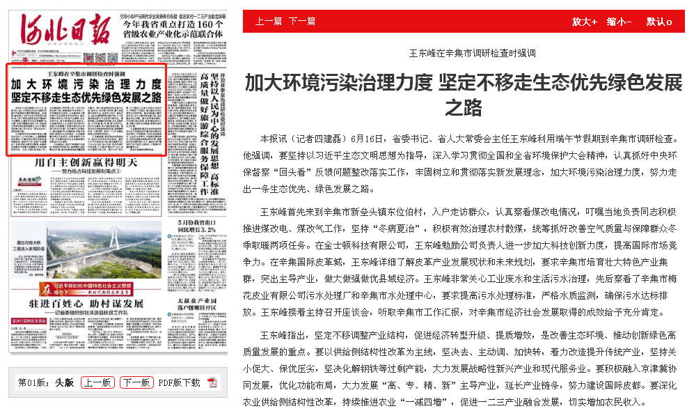 本报讯(记者四建磊)6月16日,省委书记、省人大常委会主任王东峰利用端午节假期到辛集市调研检查。他强调,要坚持以习近平生态文明思想为指导,深入学习贯彻全国和全省环境保护大会精神,认真抓好中央环保督察“回头看”反馈问题整改落实工作,牢固树立和贯彻落实新发展理念,加大环境污染治理力度,努力走出一条生态优先、绿色发展之路。