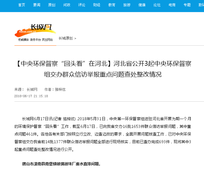 长城网:【中央环保督察“回头看”在河北】河北省公开3起中央环保督察组交办群众信访举报重点问题查处整改情况