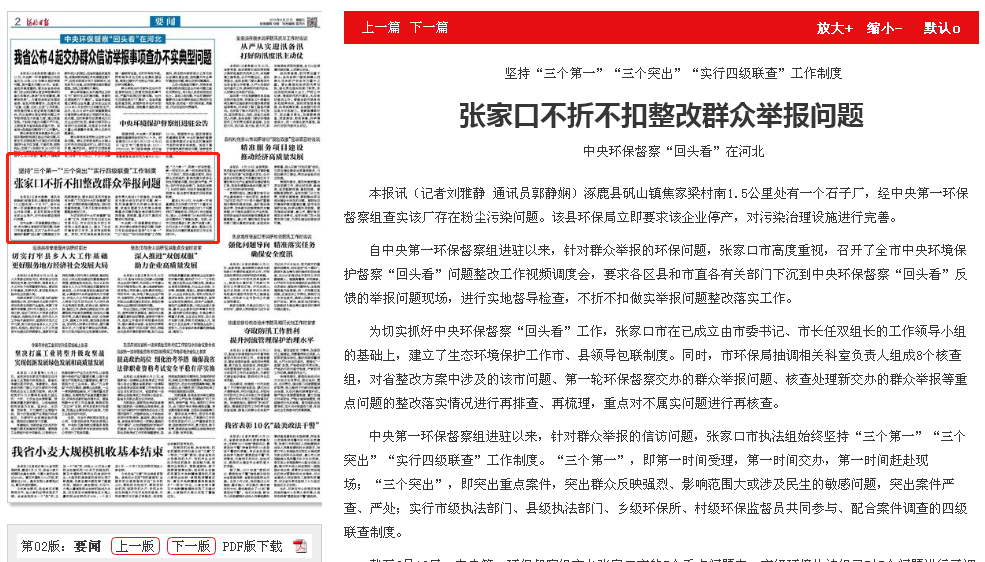 自中央第一环保督察组进驻以来,针对群众举报的环保问题,张家口市高度重视,召开了全市中央环境保护督察“回头看”问题整改工作视频调度会,要求各区县和市直各有关部门下沉到中央环保督察“回头看”反馈的举报问题现场,进行实地督导检查,不折不扣做实举报问题整改落实工作。