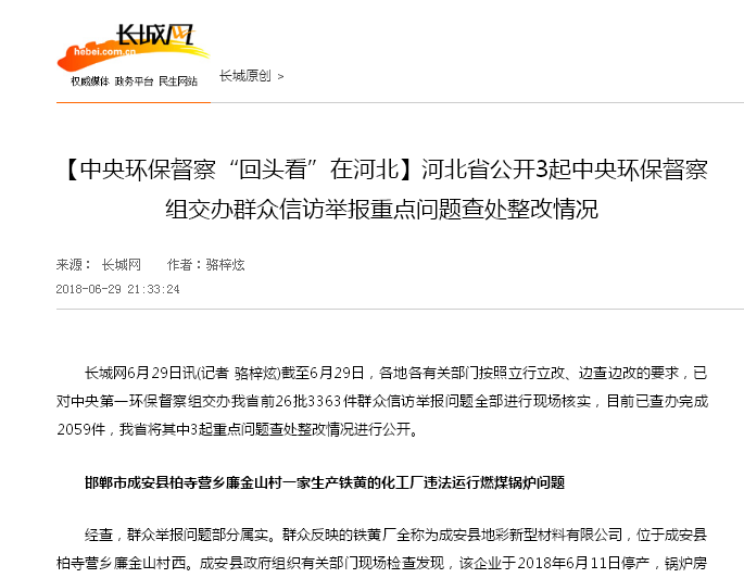 长城网:【中央环保督察“回头看”在河北】河北省公开3起中央环保督察组交办群众信访举报重点问题查处整改情况