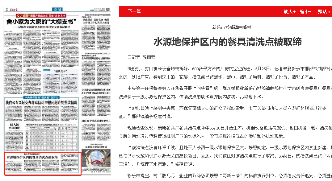 河北日报:新乐市邯邰镇曲都村 水源地保护区内的餐具清洗点被取缔