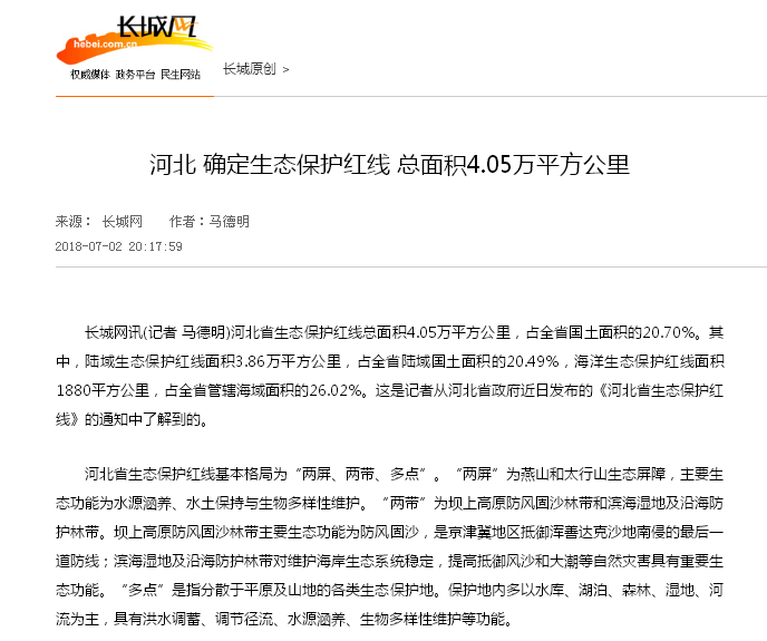 长城网:河北 确定生态保护红线 总面积4.05万平方公里