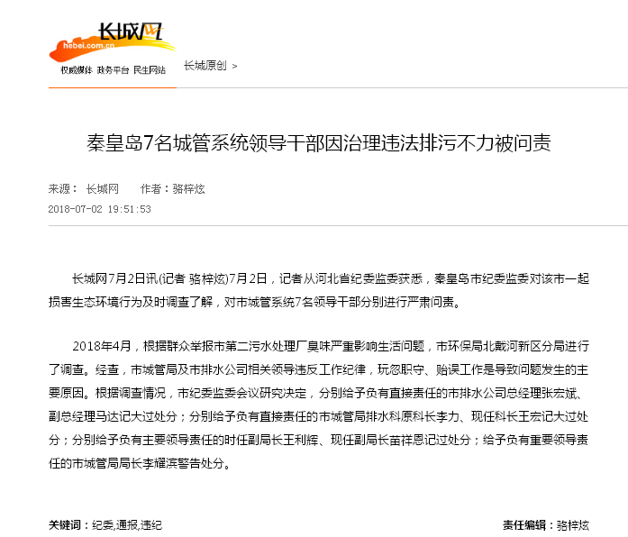 长城网:秦皇岛7名城管系统领导干部因治理违法排污不力被问责