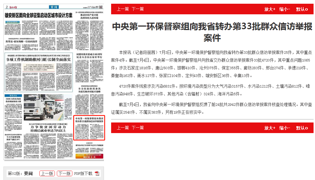 河北日报:中央第一环保督察组向我省转办第33批群众信访举报案件