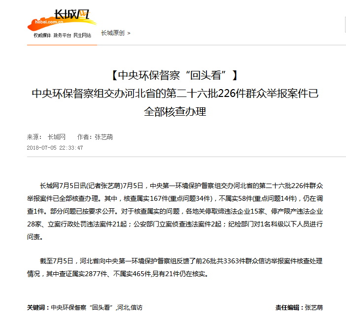 长城网:中央环保督察组交办河北省的第二十六批226件群众举报案件已全部核查办理