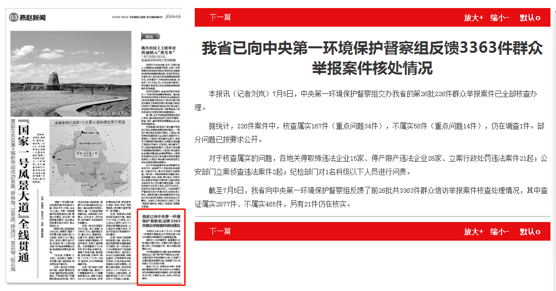 燕赵都市报:我省已向中央第一环境保护督察组反馈3363件群众举报案件核处情况