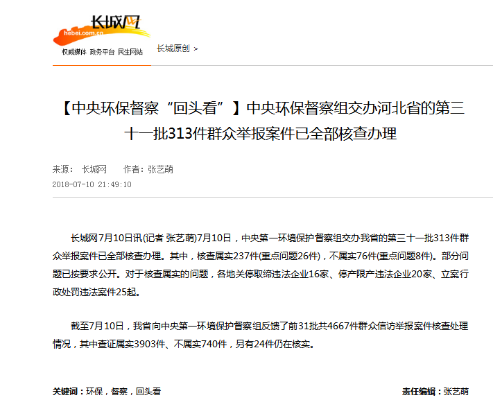 长城网:【中央环保督察“回头看”】中央环保督察组交办河北省的第三十一批313件群众举报案件已全部核查办理