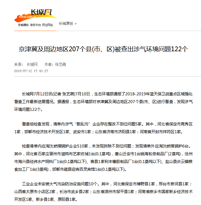 长城网:京津冀及周边地区207个县(市、区)被查出涉气环境问题122个