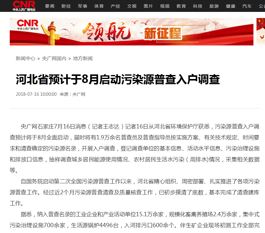 央广网:河北省预计于8月启动污染源普查入户调查