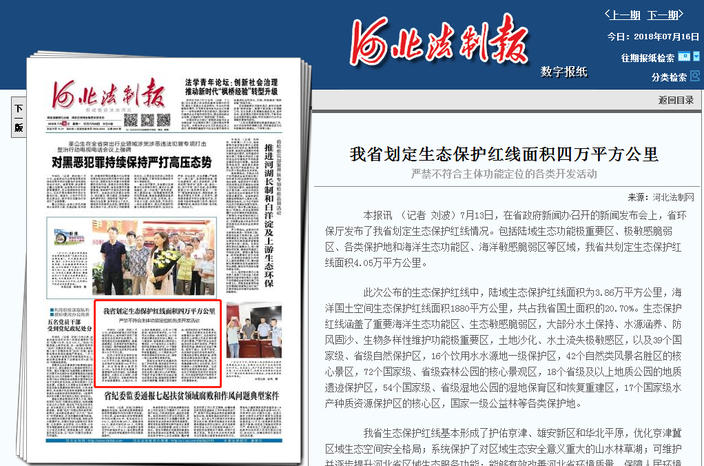 河北法制报:我省划定生态保护红线面积四万平方公里 严禁不符合主体功能定位的各类开发活动