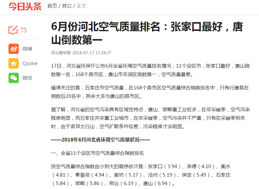 河北青年报:6月份河北空气质量排名:张家口最好,唐山倒数第一