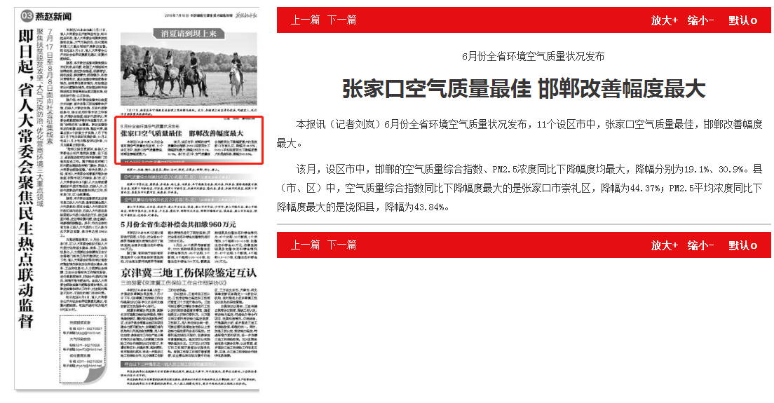 燕赵都市报:6月份全省环境空气质量状况发布 张家口空气质量最佳 邯郸改善幅度最大