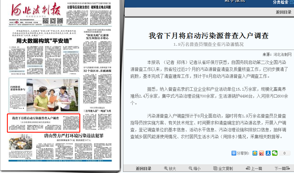 河北法制报:我省下月将启动污染源普查入户调查 1.9万名普查员细查全省污染源情况