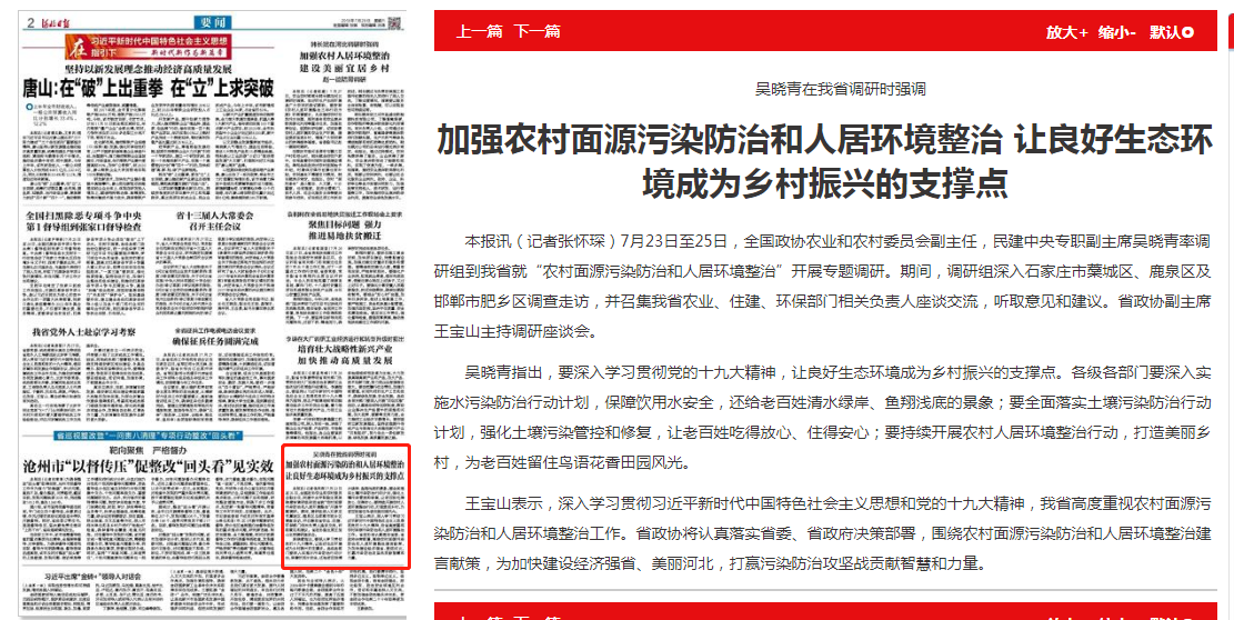 河北日报: 吴晓青在我省调研时强调 加强农村面源污染防治和人居环境整治 让良好生态环境成为乡村振兴的支撑点