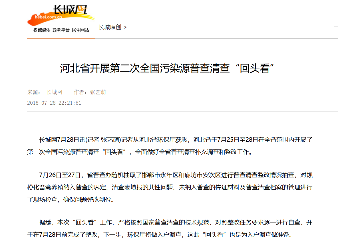 长城网7月28日讯(记者 张艺萌)记者从河北省环保厅获悉,河北省于7月25日至28日在全省范围内开展了第二次全国污染源普查清查“回头看”,全面做好全省普查清查补充调查和整改工作。