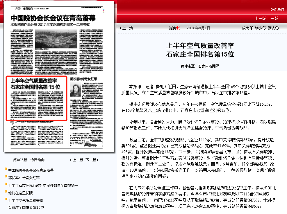 燕赵晚报:上半年空气质量改善率石家庄全国排名第15位