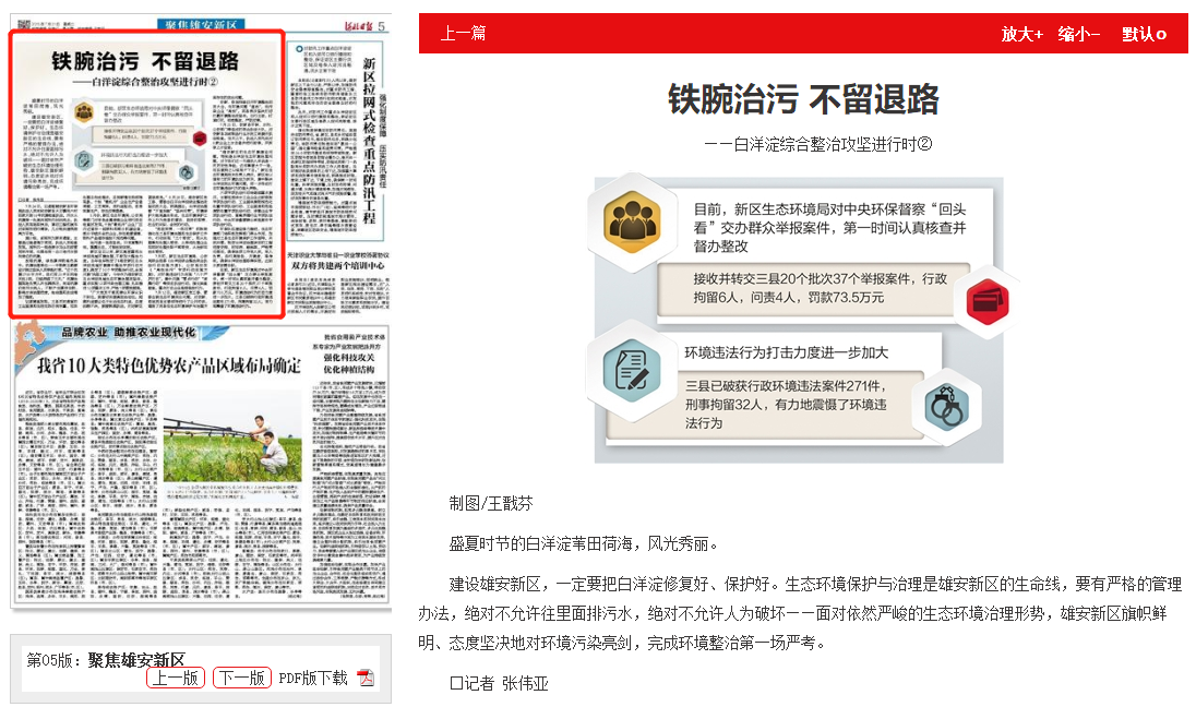 建设雄安新区,一定要把白洋淀修复好、保护好。生态环境保护与治理是雄安新区的生命线,要有严格的管理办法,绝对不允许往里面排污水,绝对不允许人为破坏——面对依然严峻的生态环境治理形势,雄安新区旗帜鲜明、态度坚决地对环境污染亮剑,完成环境整治第一场严考。