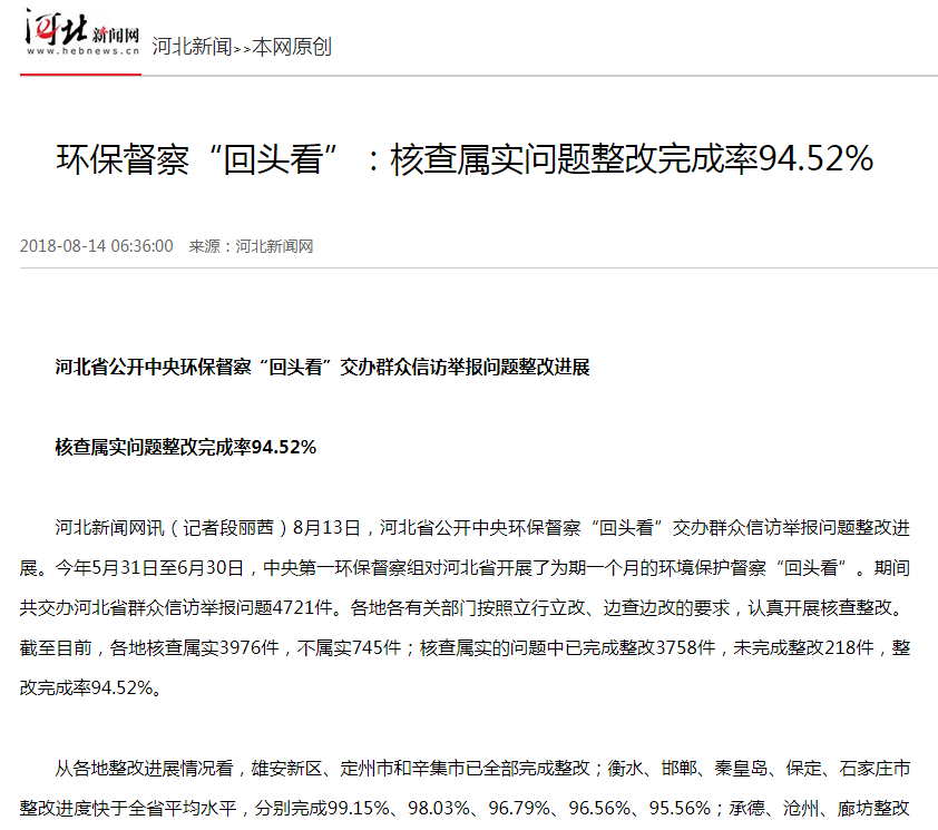 河北新闻网:环保督察“回头看”:核查属实问题整改完成率94.52%