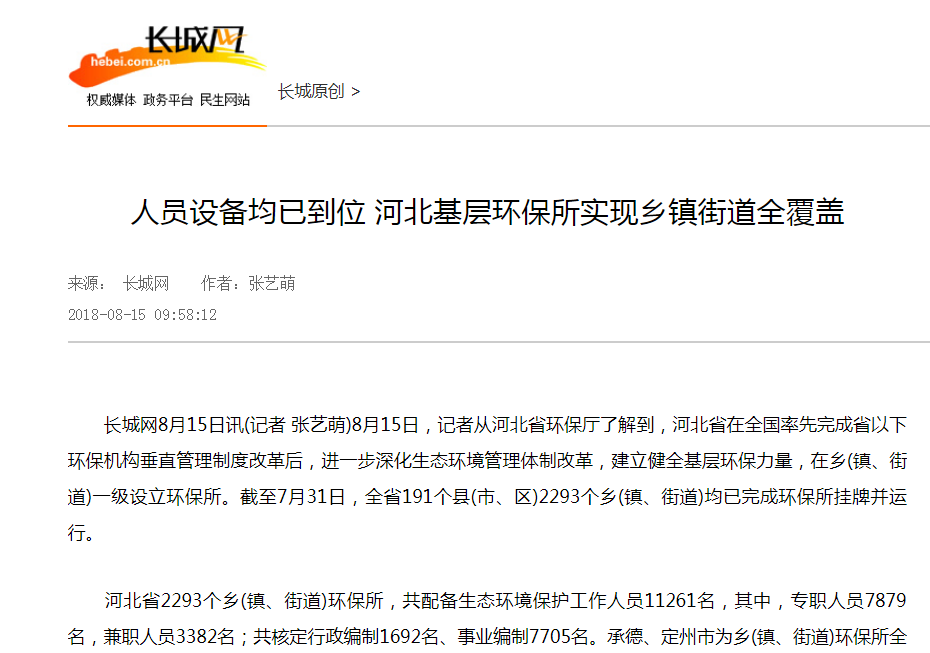 长城网:人员设备均已到位 河北基层环保所实现乡镇街道全覆盖