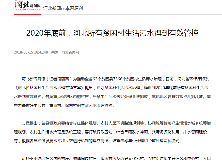 河北新闻网:2020年底前,河北所有贫困村生活污水得到有效管控