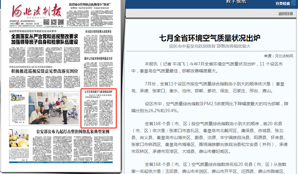 河北法制报: 七月全省环境空气质量状况出炉 设区市中秦皇岛跃居榜首 邯郸改善幅度最大