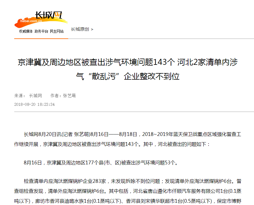 长城网:京津冀及周边地区被查出涉气环境问题143个 河北2家清单内涉气“散乱污”企业整改不到位