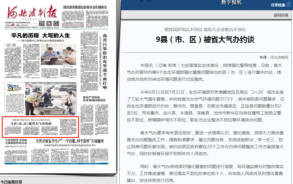 本报讯 (记者 郑伟)为全面落实主体责任,持续强化督导检查,日前,省大气办对晋州市等9个杏彩强化督查问题突出的县(市、区)进行集中约谈,推动地方政府对突出环境问题进行切实整改。