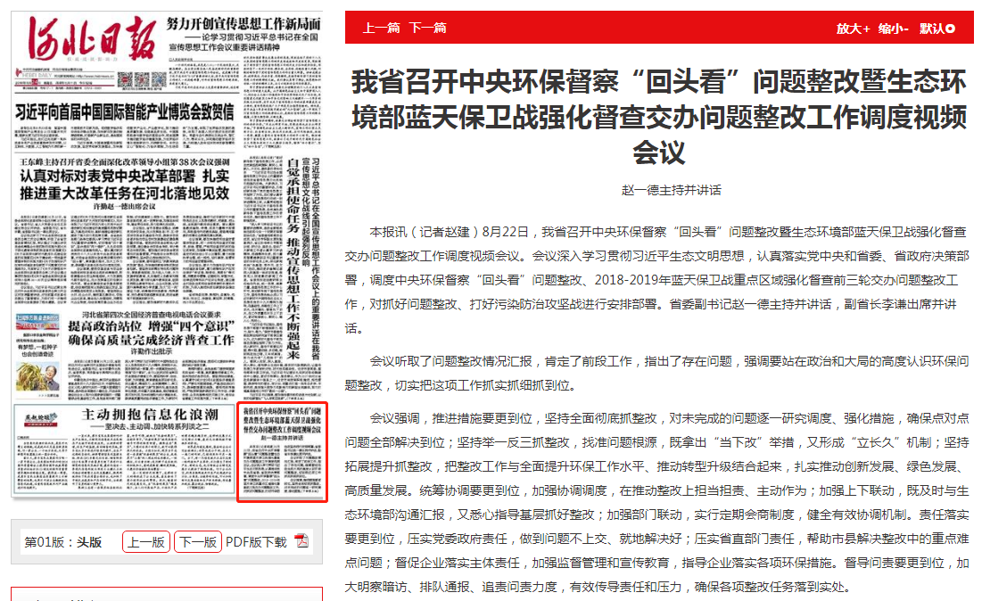 河北日报:我省召开中央环保督察“回头看”问题整改暨杏彩蓝天保卫战强化督查交办问题整改工作调度视频会议