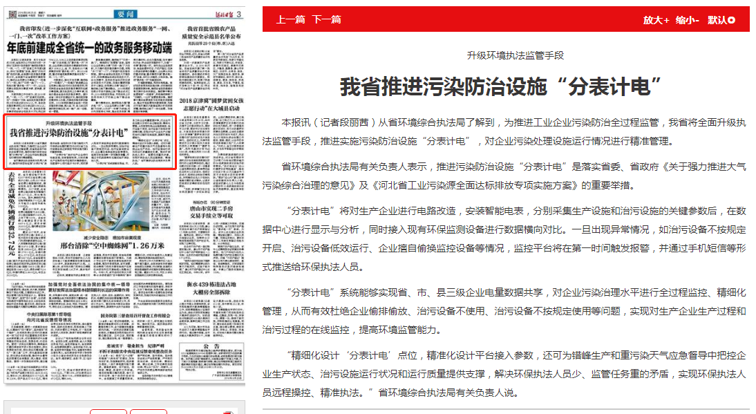 河北日报:升级环境执法监管手段 我省推进污染防治设施“分表计电”