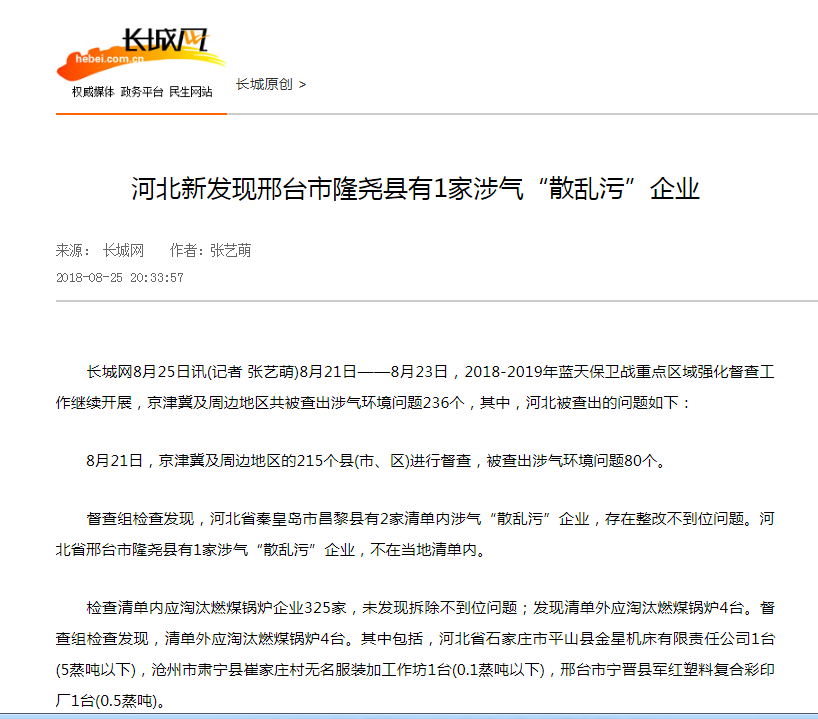 长城网:河北新发现邢台市隆尧县有1家涉气“散乱污”企业