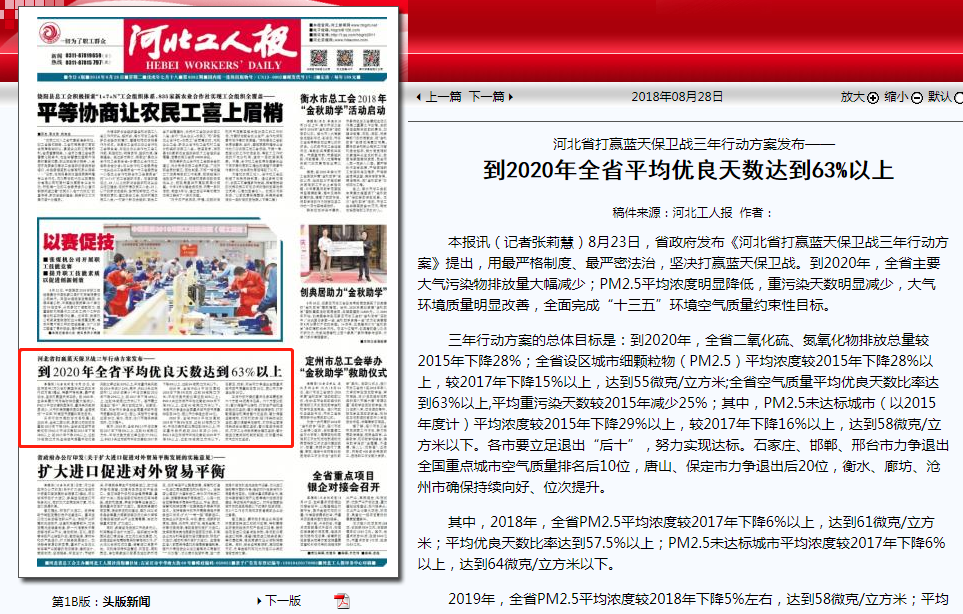 河北工人报:河北省打赢蓝天保卫战三年行动方案发布——到2020年全省平均优良天数达到63%以上