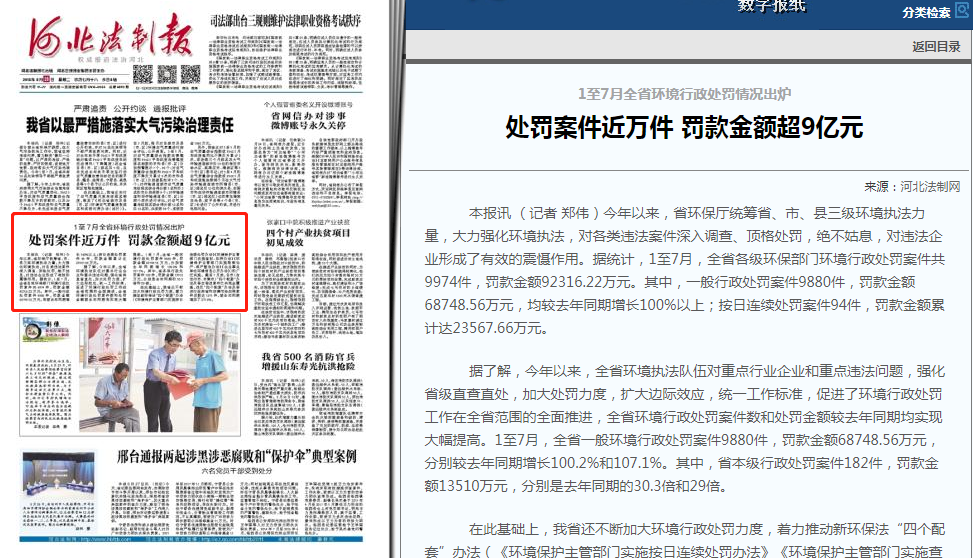 在此基础上,我省还不断加大环境行政处罚力度,着力推动新环保法“四个配套”办法(《环境保护主管部门实施按日连续处罚办法》《环境保护主管部门实施查封、扣押办法》《环境保护主管部门实施限制生产、停产整治办法》《企业事业单位环境信息公开办法》)的广泛实施。截至7月底,各市(含定州市、辛集市)“四个配套”办法及移交移送案件已实现全覆盖,违反“四个配套”办法及移送行政拘留和涉嫌污染犯罪案件总数达1071件,较去年同期增加了275.8%。