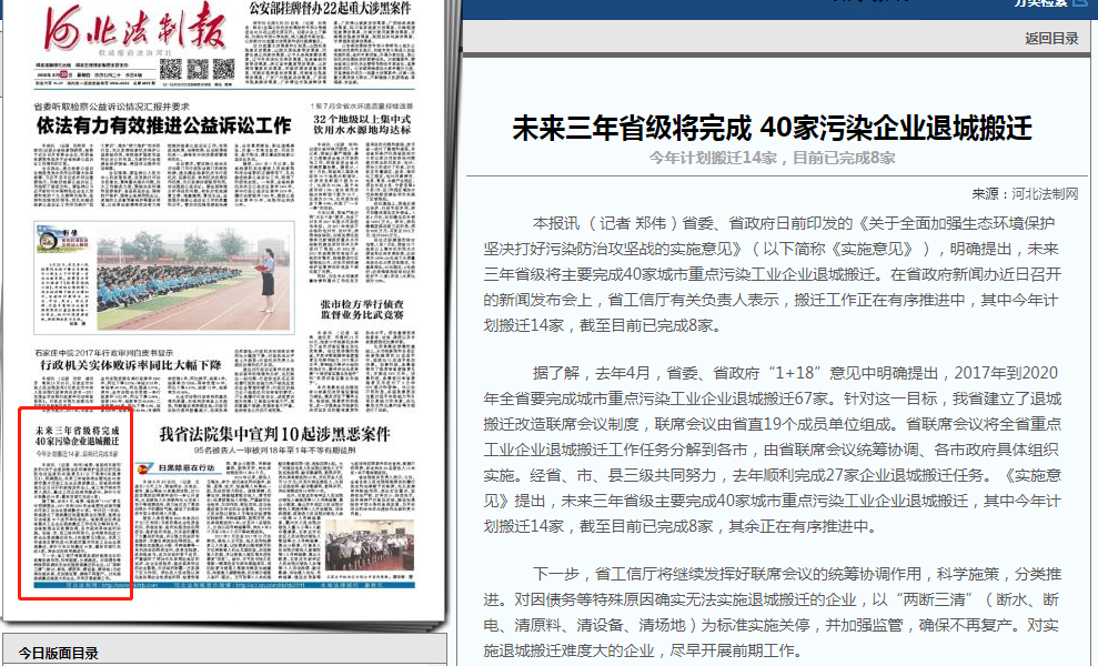 河北法制报: 未来三年省级将完成 40家污染企业退城搬迁 今年计划搬迁14家,目前已完成8家