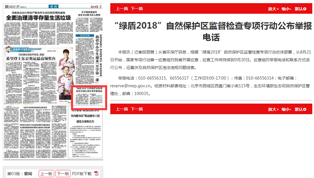 河北日报:“绿盾2018”自然保护区监督检查专项行动公布举报电话