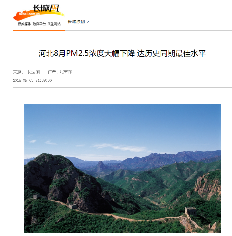 长城网:河北8月PM2.5浓度大幅下降 达历史同期最佳水平