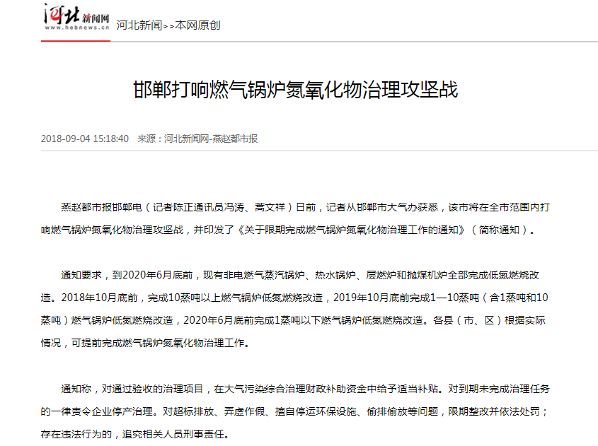 燕赵都市报:邯郸打响燃气锅炉氮氧化物治理攻坚战