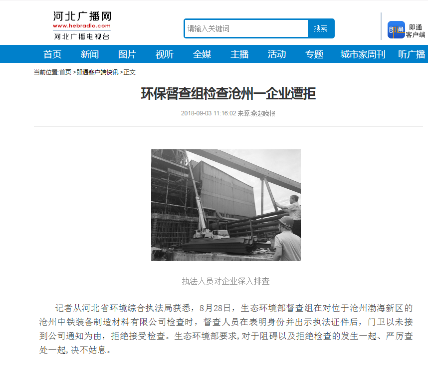 河北省环保厅对此高度重视,8月30日,成立专门执法组第一时间到达现场,深入调查违法问题。当夜22时许,组织突击夜查、暗查。现场检查发现,沧州中铁装备制造材料有限公司场区内施工工地土石方露天作业,渣土露天堆放,扬尘严重。场区内物料输送廊道多处存在封闭不严的现象。该企业烧结机脱硫设备石灰制浆时产生的剩余石灰渣、石灰窑料场物料、炼铁高炉事故渣坑部分露天堆放,未采取任何苫盖措施,粉尘无组织排放严重。该企业正在生产的四座焦炉,两孔焦侧炉门封闭不严,烟气明显外溢。拦焦集尘罩破损,查看两孔出焦情况,出焦时粉尘外溢严重,大量粉尘未经污染防治设施直接排入外环境。干熄焦落料时粉尘外溢,部分粉尘未经污染防治设施直接排入外环境。针对现场发现的环境违法行为,执法组对该企业现场制作执法文书,并依法对其立案处罚。