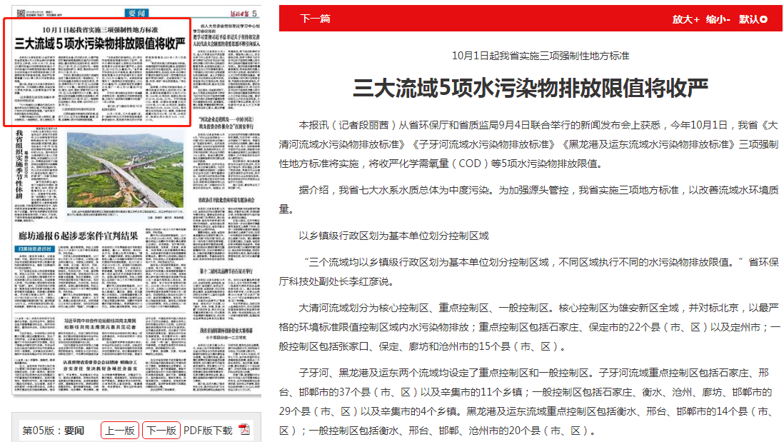 河北日报; 10月1日起我省实施三项强制性地方标准 三大流域5项水污染物排放限值将收严