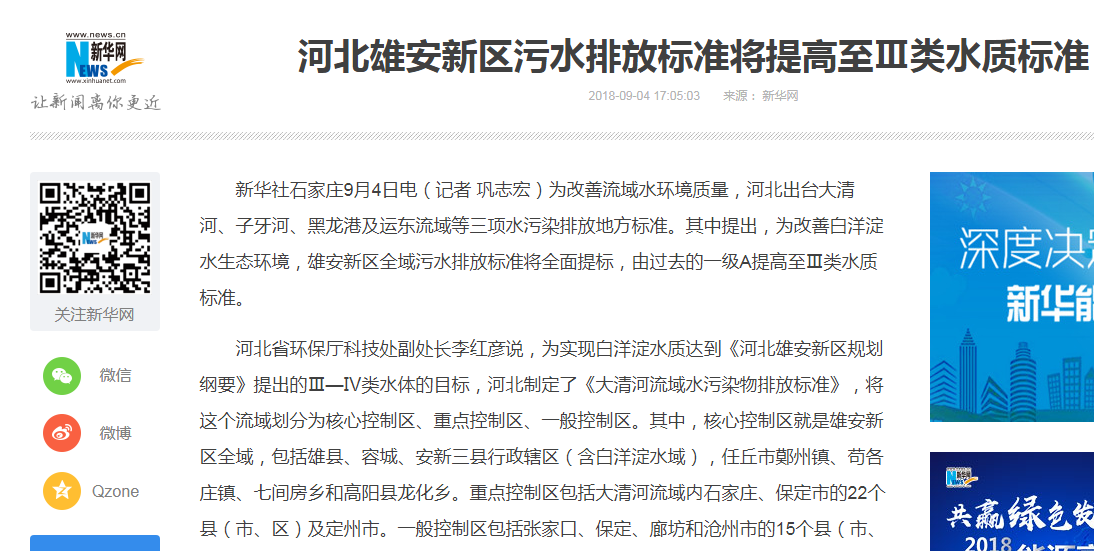 新华网:河北雄安新区污水排放标准将提高至Ⅲ类水质标准