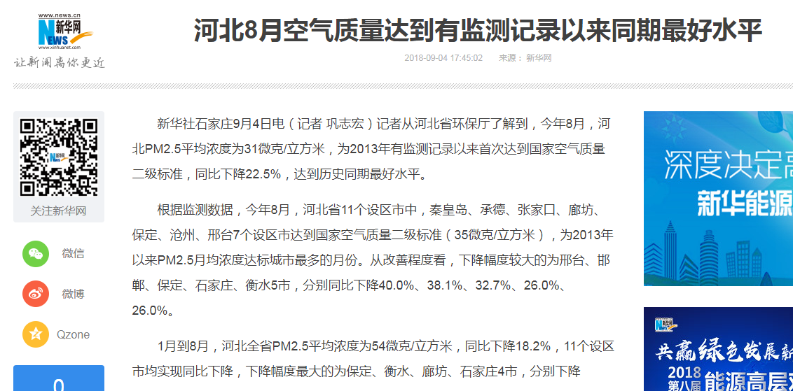 新华社:河北8月空气质量达到有监测记录以来同期最好水平